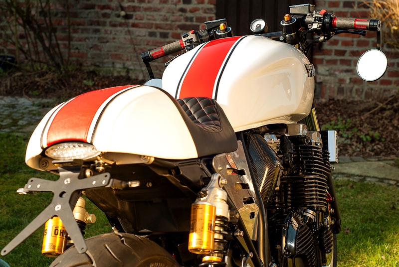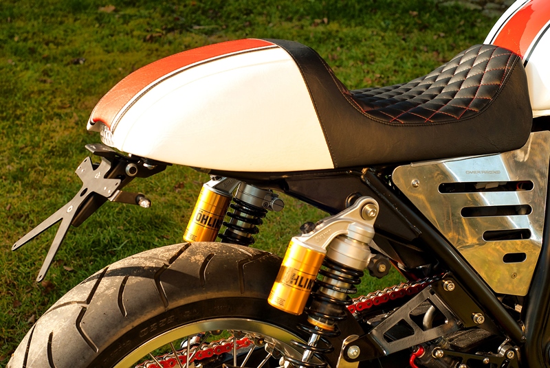 Des Weiteren kann die Sitzbank mit Ausschnitt für unser ovales LED Rücklicht oder auch ohne Ausschnitt bestellt werden. Die Sitzbank ist komplett Leder bezogen, auch der hintere Bereich des Höckers ist komplett gepolstert und Lederbezogen, Es ist keine Lackierung erforderlich! Diese Yamaha XJR Café-Racer Sitzbank verwendet die originalen Haltepunkte am Heckrahmen, somit lässt sich die Sitzbank mit der originalen Verriegelung befestigen. Die Schlosshalterung muss in diesem Fall jedoch versetzt werden, da der Heckrahmen um ca. 15cm gekürzt werden muss. Wir empfehlen die Verwendung unserer Rahmenverstrebung (Art.-Nr: 77-1009) die auch gleichzeitig Haltepunkt des Kennzeichenträgers ist, und auch das ovale Rücklicht aufnehmen kann. Diese Verstrebung ist aus Edelstahl gefertigt und wird in die offenen Rahmenrohre eingesteckt und verklemmt, nicht geschweißt. Schweißen am Heckrahmen sieht der TÜV nicht gerne, sollte der Prüfer ein Verschweißen dennoch bevorzugen, ist dies auch möglich! An dieser Rahmenverstrebung wird der Rizoma Kennzeichenhalter mit Blinkerhalter befestigt. Wenn kein Rücklicht gewünscht wird, dann kann an dem Kennzeichenhalter einfach eine Blinker / Rücklicht / Bremslicht Kombination von Rizoma (Club "S"), Kellermann, oder Highsider verwendet werden.