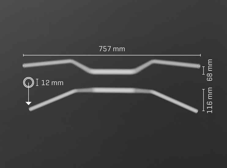 Mega stabiler, konifizierter Aluminium-Lenker mit flacher Form und einer Breite von 757mm, 68mm hoch. Durchmesser mittig 28,6mm, außen 22mm. Innendurchmesser am Lenkerende 12mm. (Passende Lenkerenden gleich mitbestellen!)