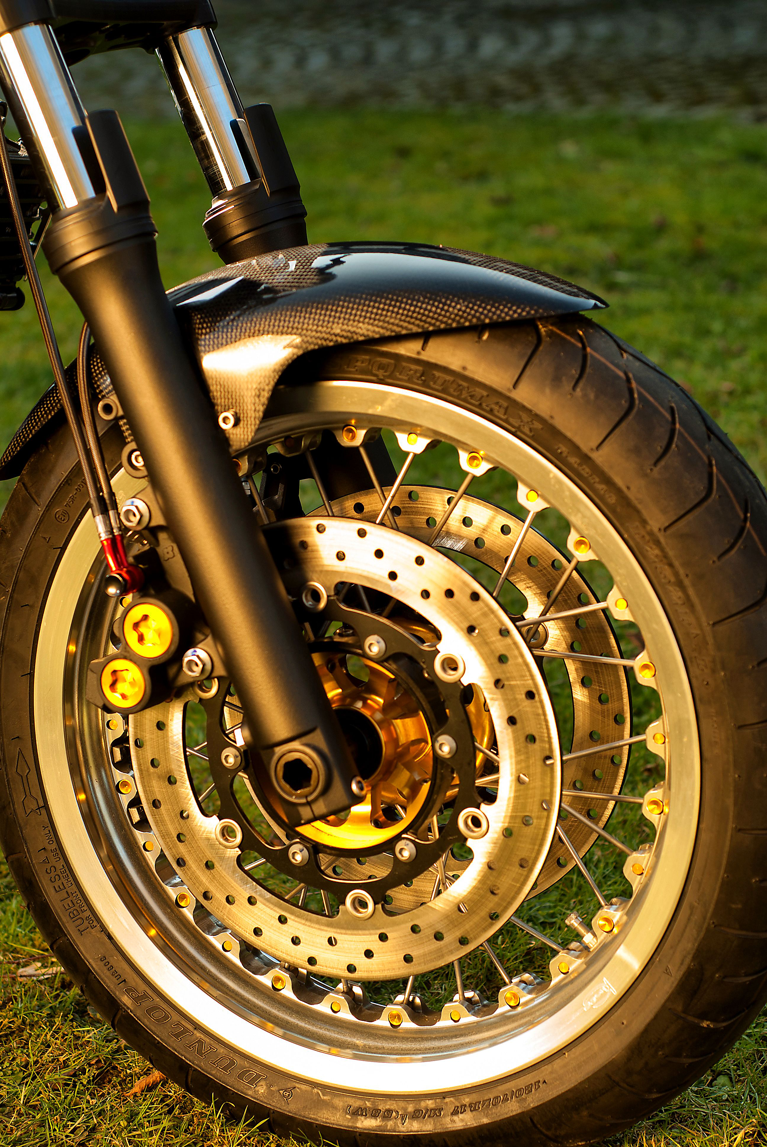 Nicht nur die tolle Optik die wir vorher schon kannten, nein, auch die technischen Details sprechen für sich. Alleine die Hinterradfelge mit Kettenradträder und Kettenrad ist sage und schreibe 4,7kg leichter als die Serienfelge. Zum Vergleich: Serienfelge XJR 1300 RP02 5,5 x 17 Zoll 11,5kg, Speichenrad in 6,00 x 17 Zoll 6,8kg. Das vordere Speichenrad wiegt nur 4,6kg. Alleine aufgrund dieser Angaben sind wir schon gespannt auf die erste Probefahrt. Die deutlich reduzierte rotierende Masse wird zu einem verbesserten Handling führen. Wie bereits vorher schon angekündigt war, die Besonderheit dieser Räder ist, dass sie mit normalen Schlauchlos-Reifen gefahren werden, es ist kein Schlauch erforderlich der das Gewicht erhöht und das Handling verschlechtert. Die Felgen sehen innen im Bett aus wie jede andere Gußfelge, nur die geniale Optik der Speichenräder mit den wunderschönen Farbvarianten kann keine Gussfelge bieten.