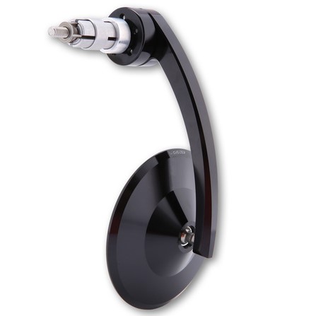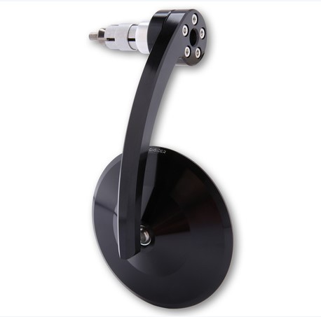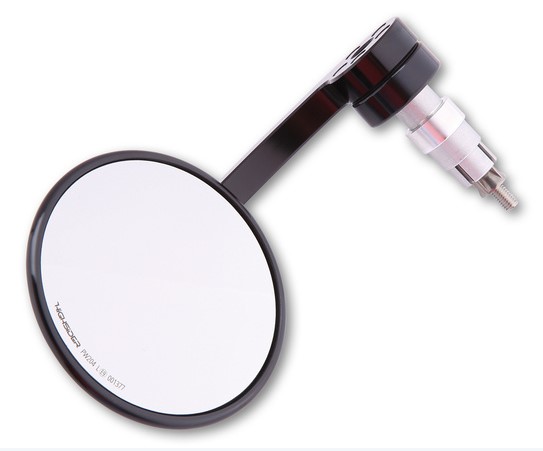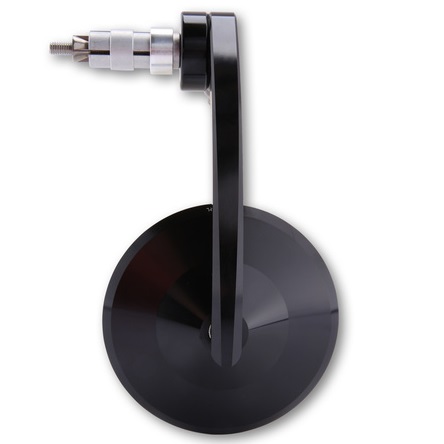 Lenkerendenspiegel Montana EVO mit Lenkerenden-Befestigung, glänzend-schwarz. Mit dem schönen runden Spiegel mit 95mm Spiegelglasdurchmesser hast Du beste Rücksicht bei minimalster zugelassener Spiegelfläche! Der Montana EVO Spiegel wird von Außen ins Lenkerende eingesteckt und dort verschraubt. Es sind verschiedene Alu-Hülsen für sämtliche Lenker im Lieferumfang enthalten. Geeignet für 22mm und auch 1" (25,4mm) Lenker. Der Spiegel ist E-geprüft und darf an jedem Motorrad verbaut werden. Der Spiegel mit Haltesatz ist so aufgebaut, dass er am rechten wie am linken Lenkerende befestigt werden kann. Super schöner zugelassener Lenkerendenspiegel für coole Bike-Umbauten. Cafe-Racer, Scrambler, oder einfach nur weil´s geil ist!